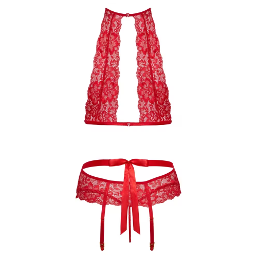 Inkluderer en overdel, hofteholder og matchende string i nydelige, røde blonder.