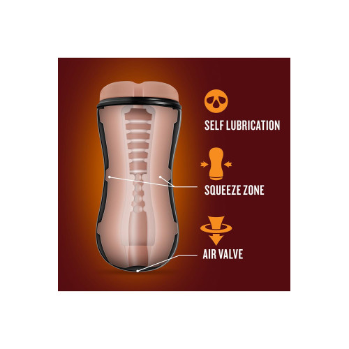 Ønsker du mer stimulering? Hold over ventilen i toppen og oppdag deilige sug som vil gjøre deg helt vill! Masturbatoren har også et stimulerende mønster som gir det lille ekstra under opplevelsen. Masturbatoren kan også klemmes lett på midten for å regulere trangheten!