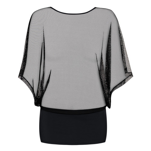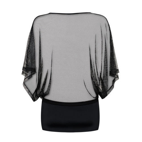 Sort minikjole med vid, gjennomsiktig overdel og tettsittende miniskjørt.