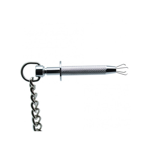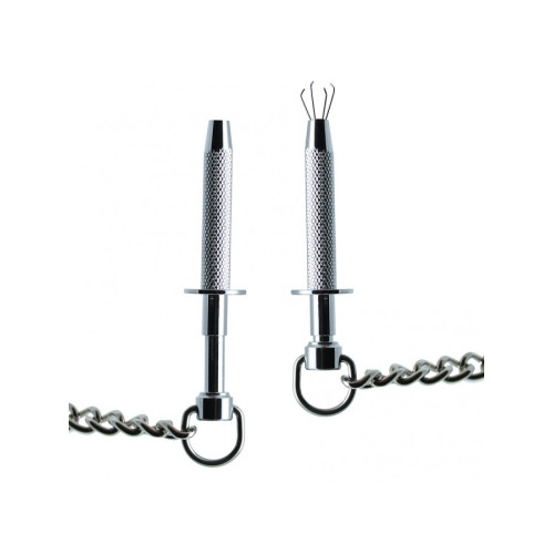 Brystklyper i metall med skarpe klyper, som kommer ut når du trykker inn stemplene.