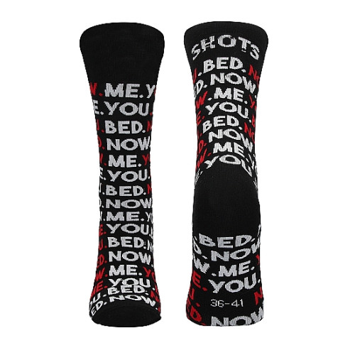Disse "You.Me.Bed.Now." sokkene fra Sexy Socks gir et tydelig budskap! "You.Me.Bed.Now." danderer den sorte sokker i hvitt og rødt.