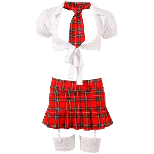 Kort knytebluse, skotskrutet foldeskjørt med frekk åpning bak, hvor baken på rysjetrusen med påsydde, stillbare strømpestropper synes!