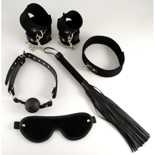 Settet tilbyr øyebind, gag med pustehull og justerbare spenner, hånd- og ankelcuffs med borrelås, collar og en enkel flogger.