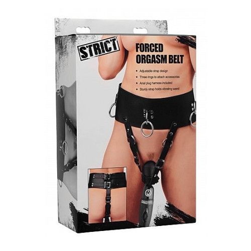 Få din partner til å komme igjen og igjen med orgasmebelte fra Strict. Dette beltet passer til alle standard massasjestaver og er justerbar med spenner rundt midjen, ben og i skrittet.